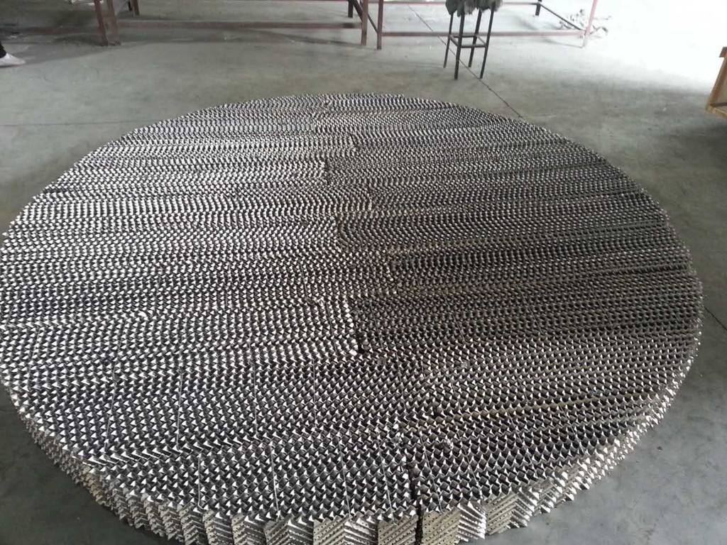規(guī)整填料可分為波紋型和非波紋型,其中非波紋型包括柵格型、格里奇柵格、板片型、壓延金屬板填料、多孔金屬板填料、繞圈性、古德洛填料等。波紋型又分為水平波紋型和垂直波紋型兩大類。垂直型包括金屬絲網(wǎng)、塑料絲網(wǎng)、網(wǎng)板等。板狀的有金屬孔板、塑料孔板、陶瓷孔板、壓延板孔板等。水平波紋型有斯普雷帕克、帕納帕克等