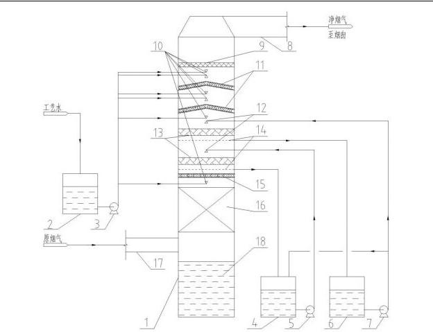 [0016] 圖中:1 .脫硫塔,2 .工藝水罐,3 .工藝水泵,4 .一級循環(huán)水罐,5 .水洗泵,6 .二級循環(huán)水罐,8 .凈煙氣煙道,9 .絲網(wǎng)除沫器,10 .沖洗水噴淋頭,11 .屋脊式除霧器,12 .水洗布液器,13 .水洗填料,14 .氣液分離器,15 .脫硫液除霧器,16 .脫硫段,17 .煙道,18 .漿液儲存區(qū)。